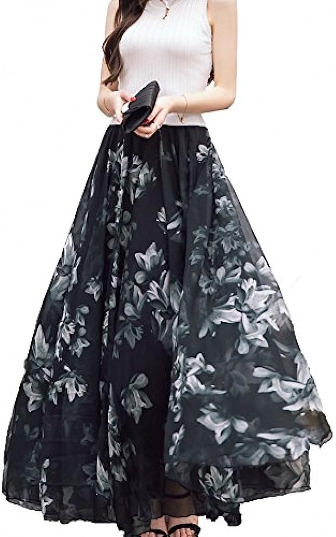 • Floral print casual A-line maxi skirts with elastic high waisted design,floor length.Plus size long maxi dress skirt can be beach dress,easy to dress up and down.